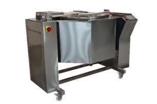 Sartén redonda cónica , volcable fabricada íntegramente en Acero Inoxidable para preparación de alimentos, que permite descargar en carros